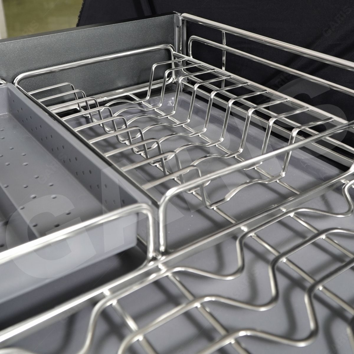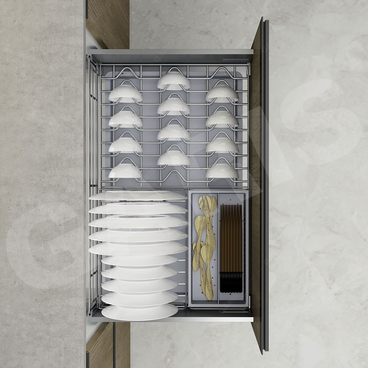 Giá bát đĩa thìa đũa vách hộp MD02V là phụ kiện tủ bếp cao cấp được thiết kế để giúp gia đình sắp xếp bát đĩa, thìa đũa một cách gọn gàng, sạch sẽ và tối ưu không gian lưu trữ. Sản phẩm giá bát đĩa thìa đũa vách hộp MD02V sử dụng inox 304 nguyên khối, chống gỉ tuyệt đối, phù hợp môi trường ẩm trong tủ bếp. Với thiết kế rổ nan oval sang trọng và hệ ray âm giảm chấn MEGKEL, giá bát đĩa thìa đũa vách hộp MD02V mang đến trải nghiệm kéo mở êm ái và độ bền vượt trội.