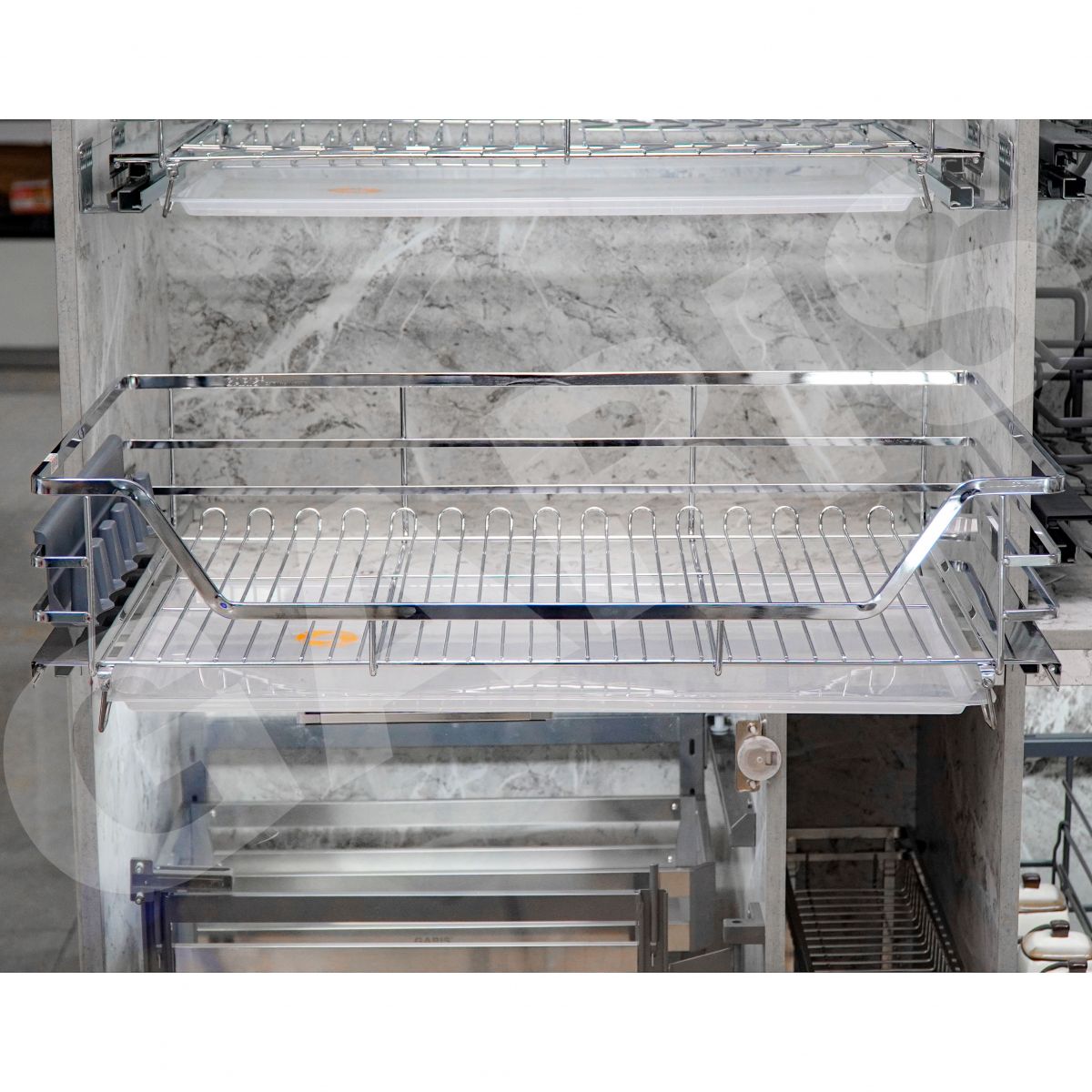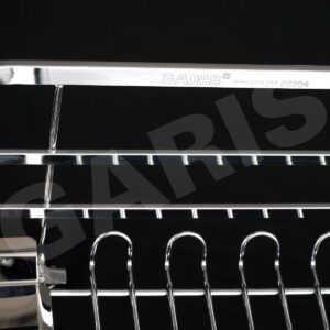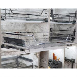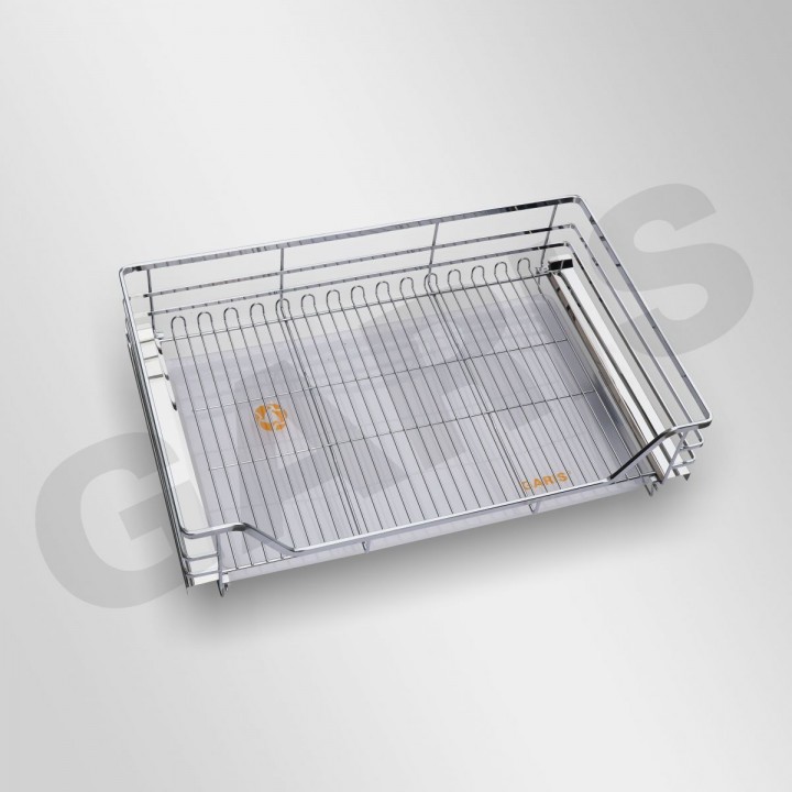 Giá xoong nồi rổ nan dẹt cánh mở GP04C làm từ inox 304 mạ chrome 5 lớp, chịu tải 25kg, ray âm giảm chấn GARIS. Thiết kế gọn gàng, bền đẹp, giúp sắp xếp xoong nồi khoa học và tối ưu không gian tủ bếp.